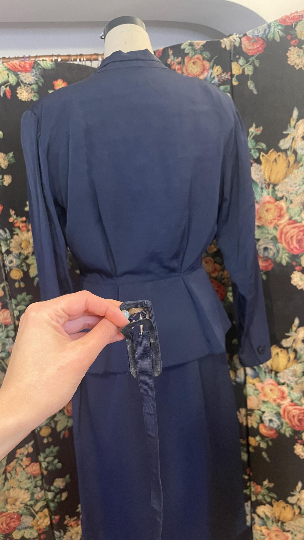 Sophisticated power suit for 1940s vintage revival fans! Chic true vintage ladies two piece skirt suit in navy grosgrain, this sleek set was made by 'Strohback' in London, 1940s England. Aline Midi skirt and fitted blazer with power collar/ lapels, sleek belt and detailed buttons.