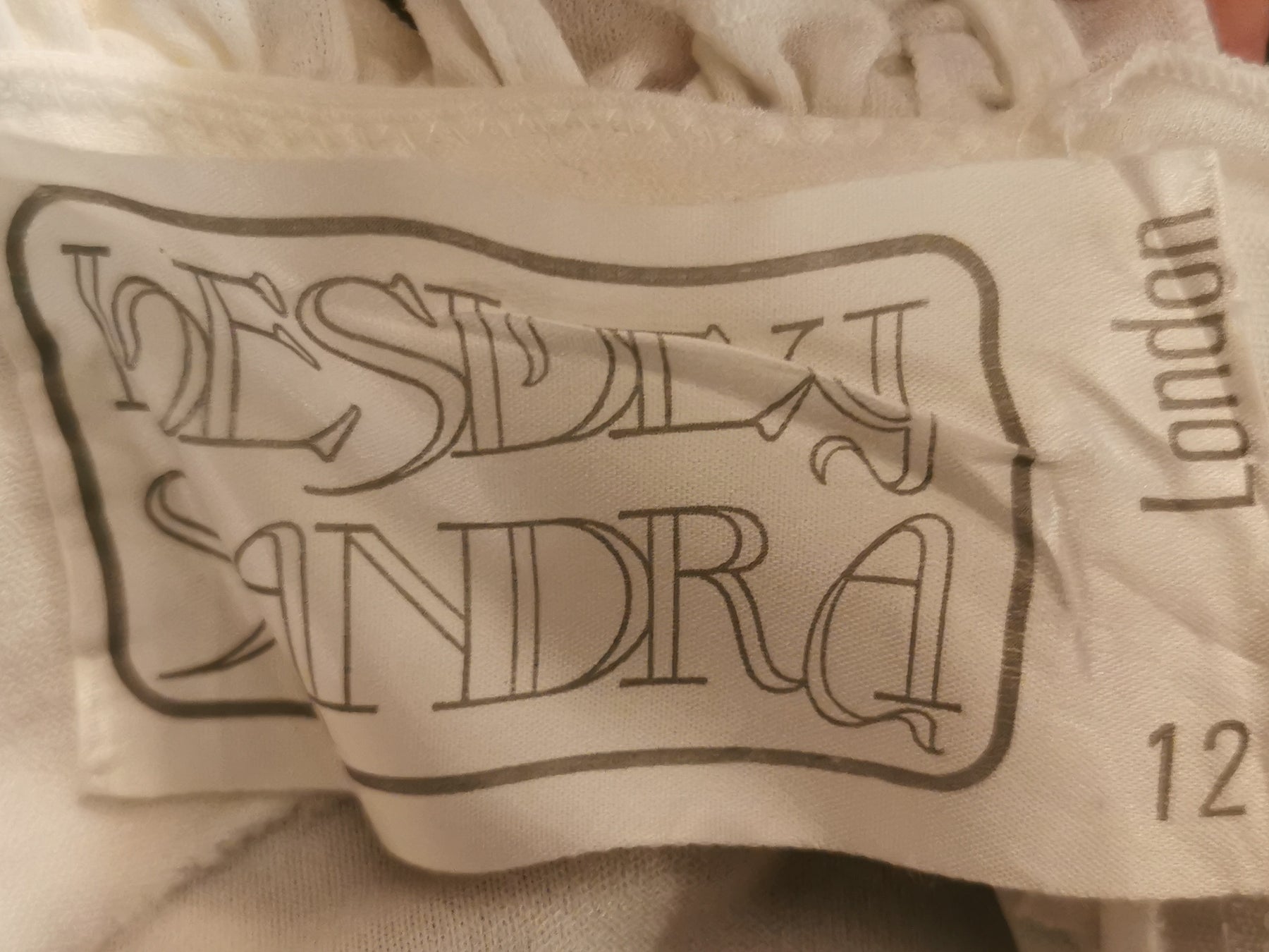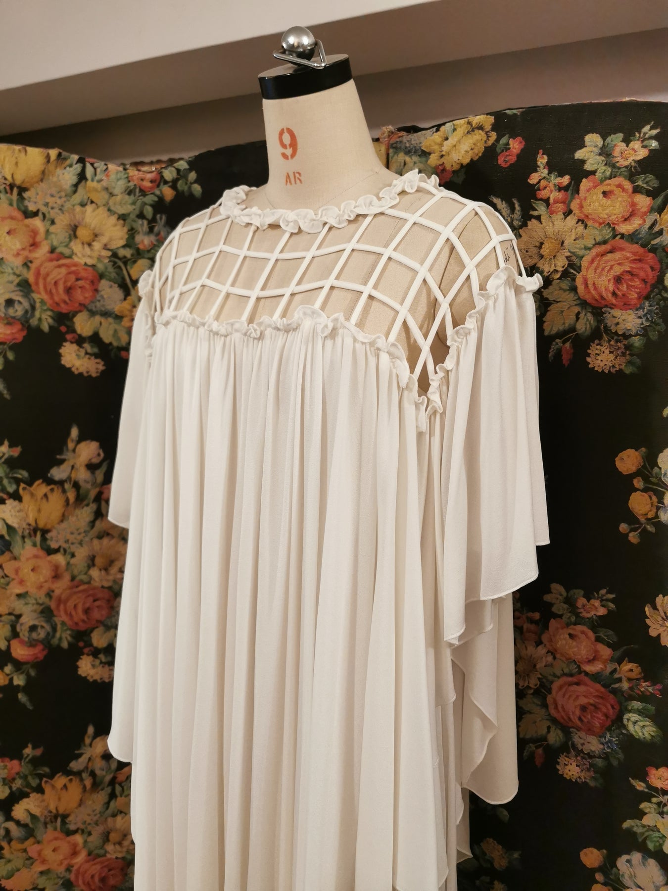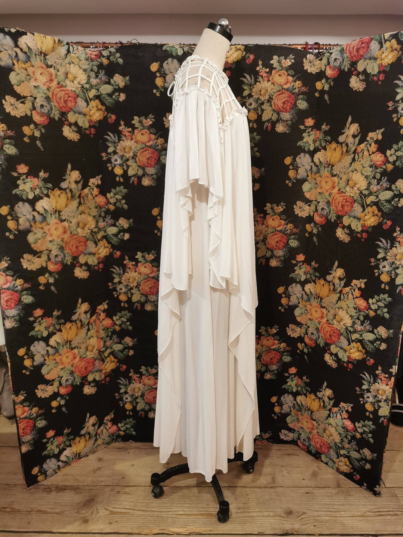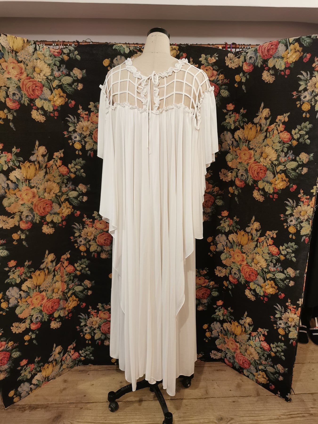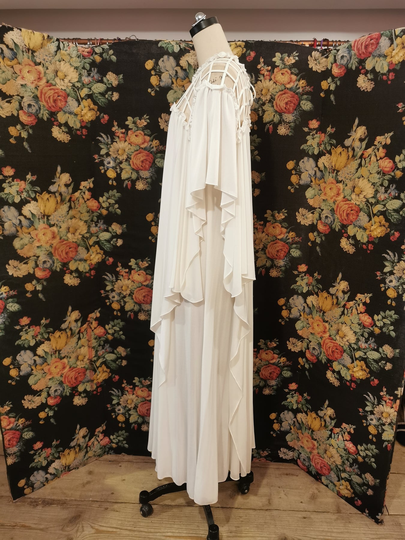 Regular price £150.00 Save £-150.00Super special 1970s kaftan dress made from slinky white jersey. The criss cross ribbon effect over the shoulders and ruffle trim details give this vintage look a contemporary flair and the gathered kaftan falls beautifully over a stretchy floor length maxi shift. The soft and silky fabric is perfect to celebrate your wedding day in comfort and style.