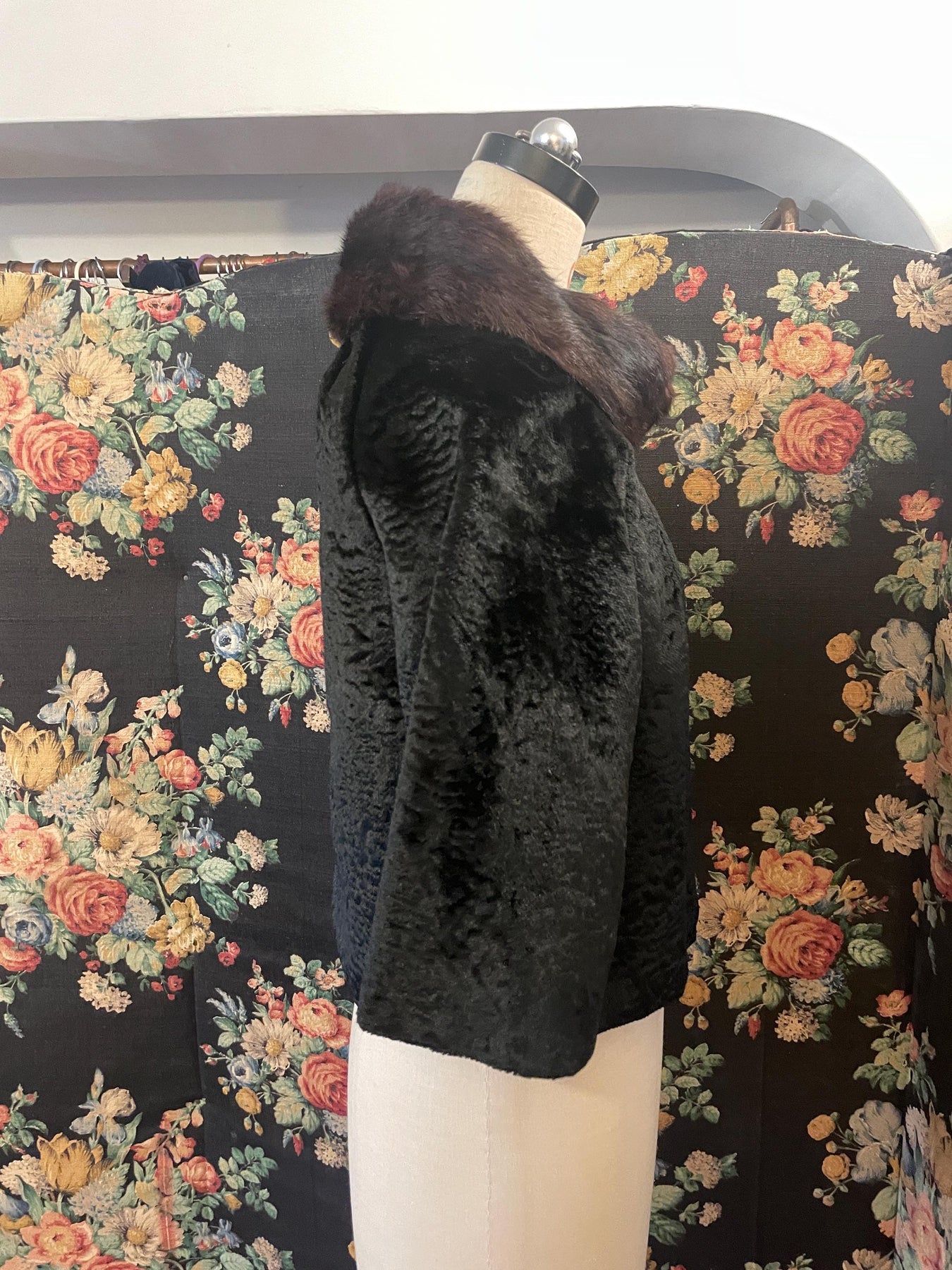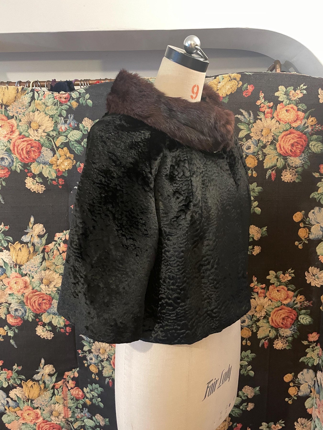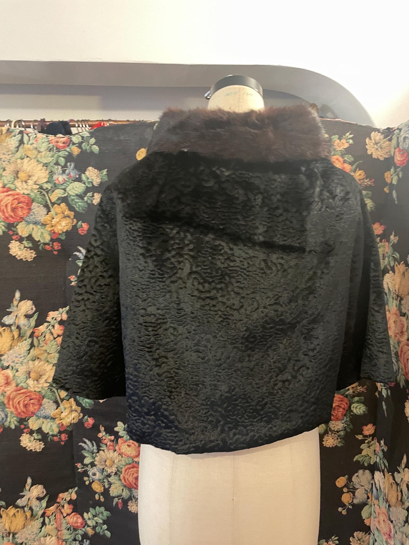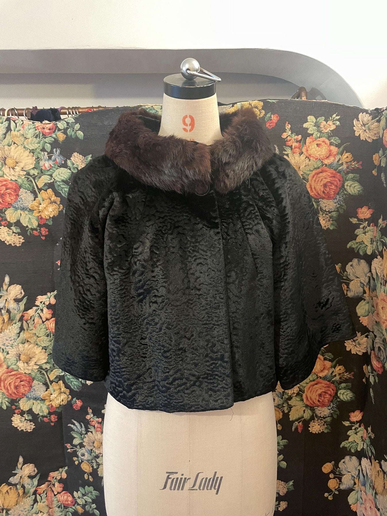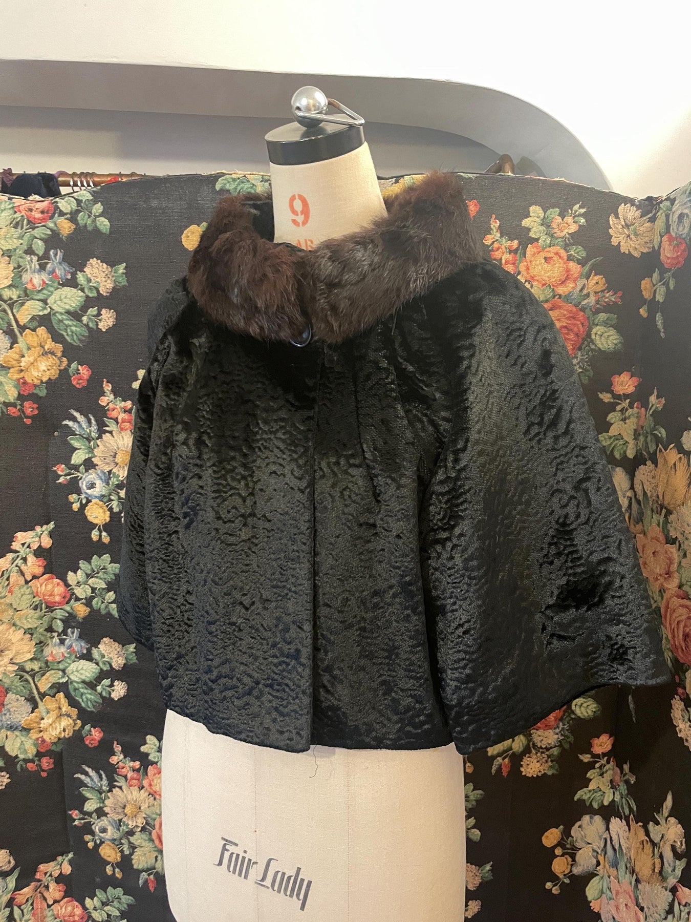 1950s vintage black embossed velvet brown fur collar jacket ladies evening cropped coat. Great condition. Best fit at 8-12