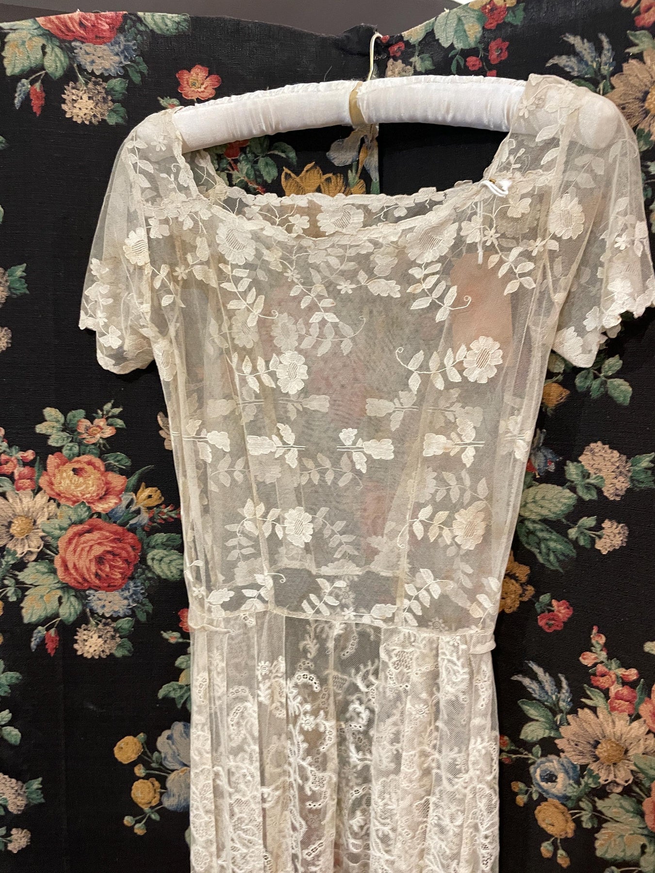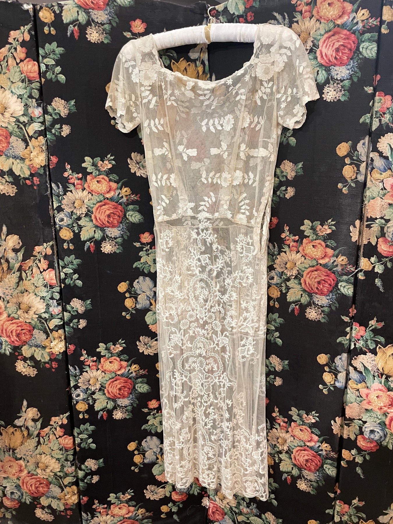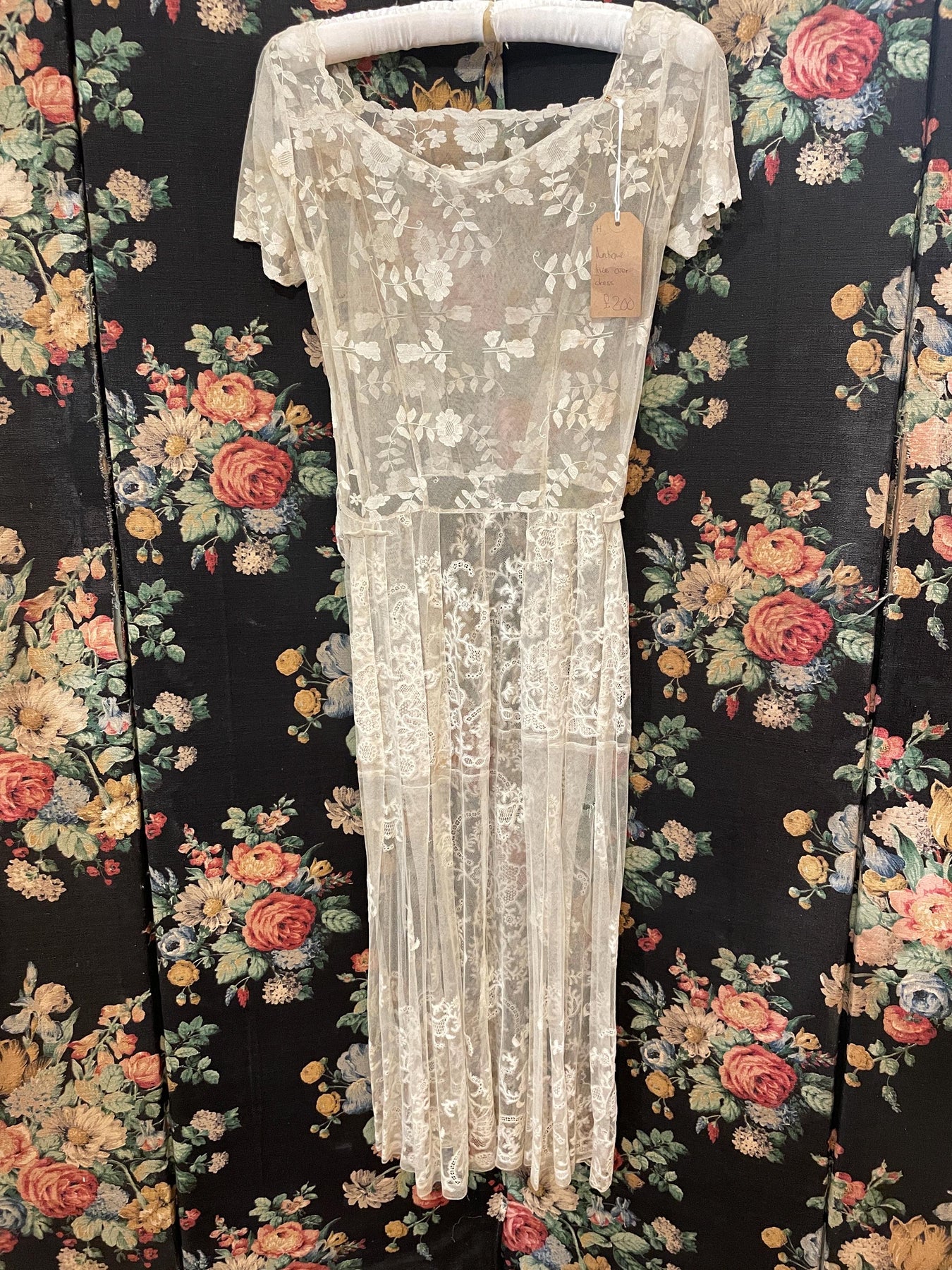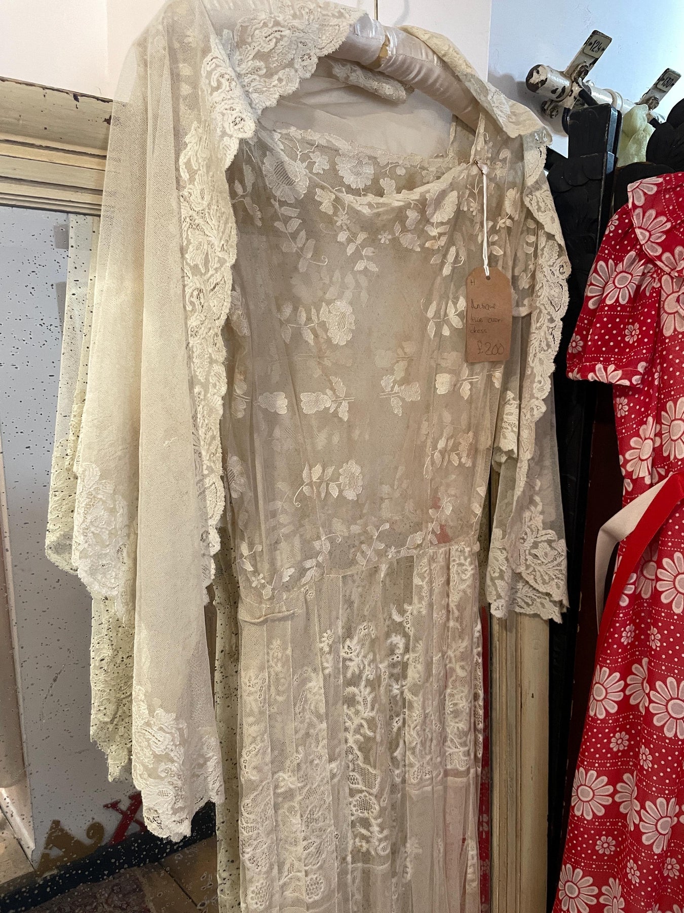 Regular price £230.00 Save £-230.00Beautiful antique lace over dress. Cream lace with floral and decorative designs. Would be lovely as a vintage wedding dress with a little silky slip underneath I cream or even pastel shades. Alternatively, go sexy and wear just a simple bodysuit for a more sheer look!
